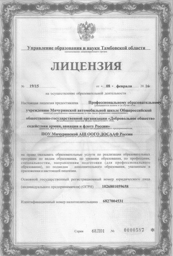 Настоящее заключение предоставлено Профессиональному образовательному учреждению мичуринская автомобильная школа общероссийской общественно-государственной организации «Добровольное общество содействия армии авиации и флоту России». Сокращенно ПОУ Мичуринская АШ ООГО ДОСААФ России вышеуказанным адресам соответствует установленным требованиям.